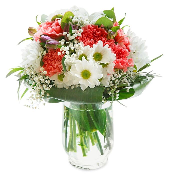 Welcome the beauty of our crafted floral arrangement, designed as a luxurious expression of care and sophistication. Carefully curated from hand-picked flowers, this bouquet features the ethereal charm of snow-white chrysanthemums, the delicate appeal of gypsophila, and the soft grace of light pink carnations, all complemented by rich aspidistra leaves.